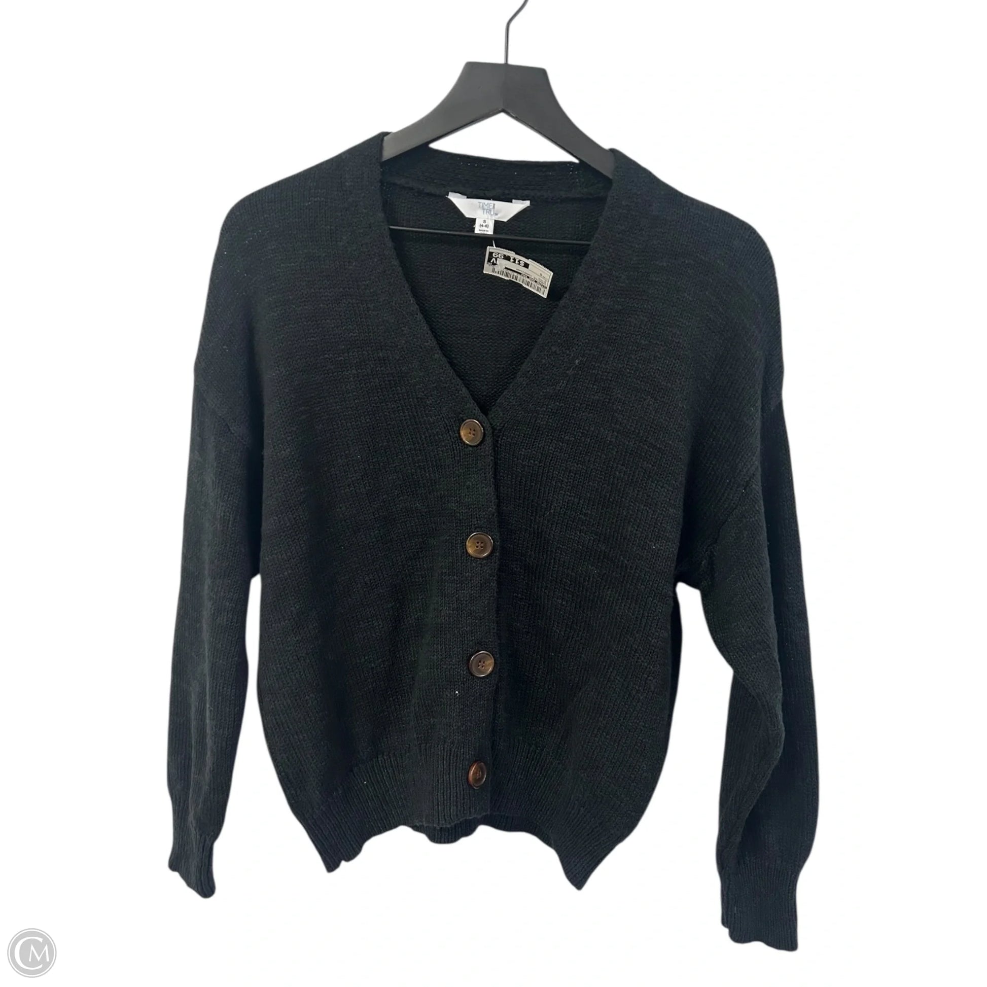 Stay cozy and chic in this timeless black sweater cardigan by Time and Tru. Crafted for style and comfort, the size S fits perfectly. Add a classic touch to your wardrobe today!